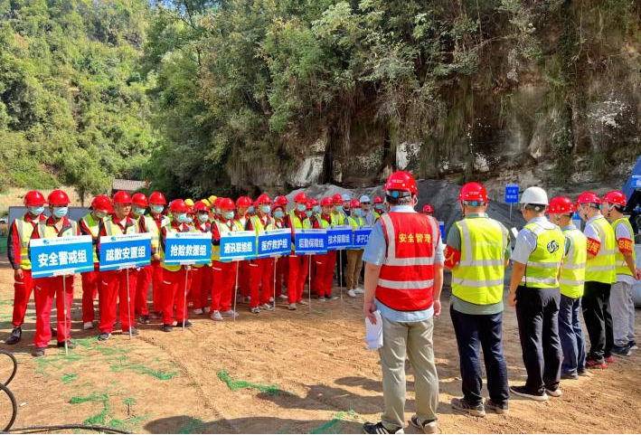 此次演練主要有演練動員、現(xiàn)場演練、演練總結(jié)三個環(huán)節(jié),包含了應(yīng)急預(yù)案啟動、人員疏散、機(jī)械撤離、隧洞洞口封堵等四個場景。
