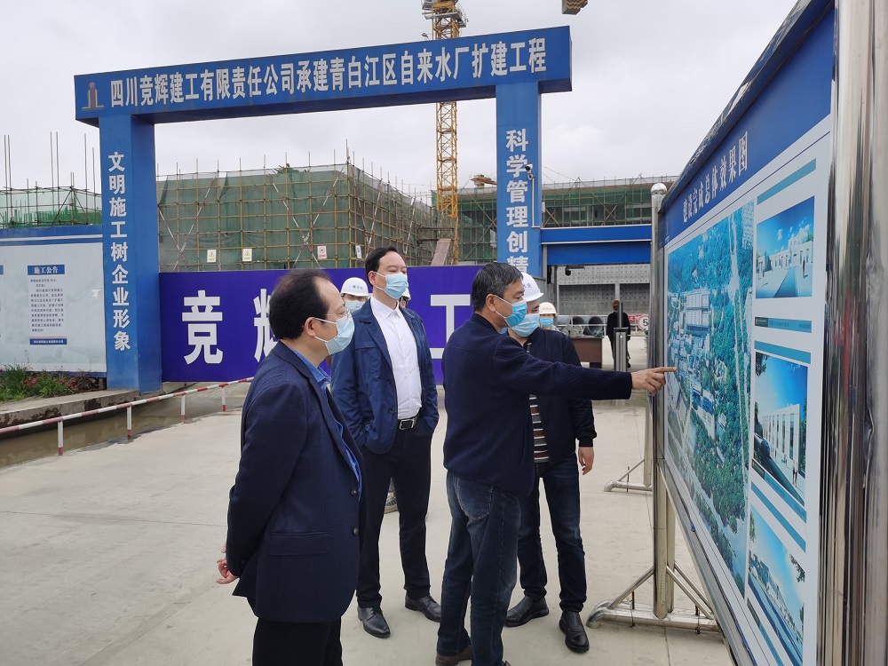 鐘杰董事長一行首先前往成都青白江水業(yè)股份有限公司,先后視察了該公司20T自來水廠擴建項目工地和現(xiàn)有自來水生產(chǎn)線,詳細詢問了工程規(guī)模、建設進度、質量控制、安全生產(chǎn)等情況,聽取了成都青白江水業(yè)股份有限公司經(jīng)營班子工作匯報。