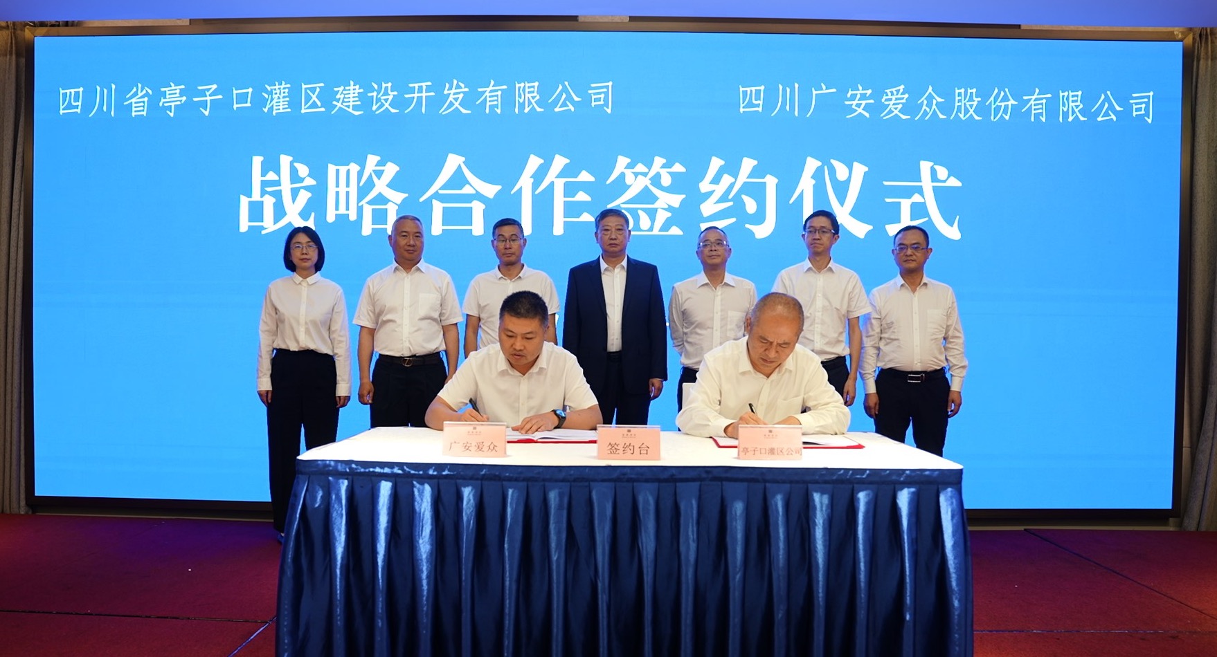 10月18日,四川省亭子口灌區(qū)建設(shè)開發(fā)有限公司與四川廣安愛眾股份有限公司戰(zhàn)略合作簽約儀式在廣安富盈酒店舉行。省水發(fā)集團董事羅國書,廣安愛眾公司黨委書記、董事長余正軍,黨委副書記、總經(jīng)理何臘元;亭子口灌區(qū)公司黨委書記、董事長廖建強,黨委副書記、副董事長、總經(jīng)理文祥明出席儀式。