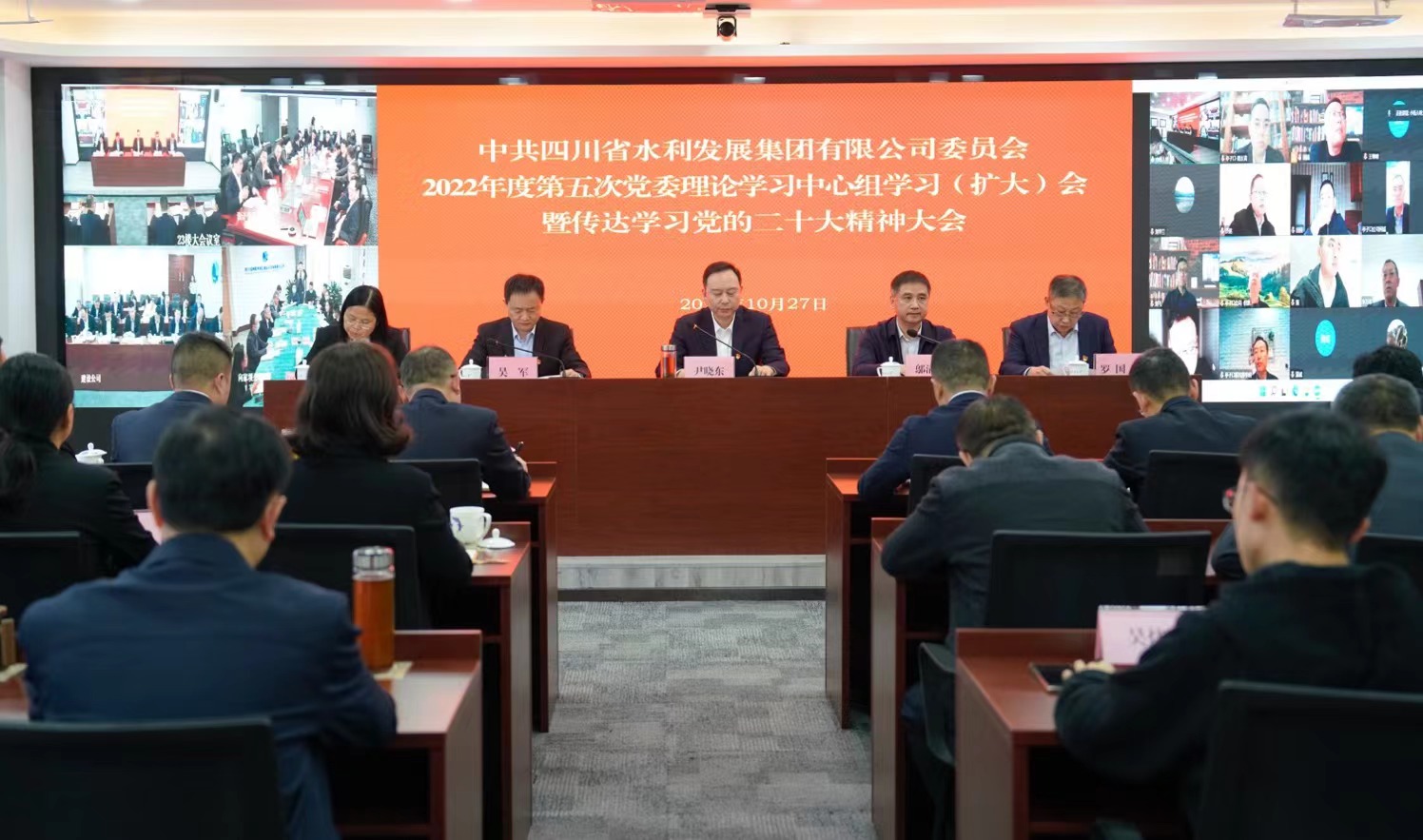 10月27日,集團召開2022年度第五次黨委理論學習中心組(擴大)會議暨傳達學習黨的二十大精神大會,專題學習傳達黨的二十大報告精神、習近平總書記在參加黨的二十大廣西代表團討論時的重要講話精神、習近平總書記在黨的二十大閉幕會上的重要講話精神、習近平總書記在二十屆中共中央政治局常委同中外記者見面時的重要講話精神,關(guān)于十九屆中央紀律檢查委員會工作報告的決議、關(guān)于《中國共產(chǎn)黨章程(修正案)》的決議,以及四川省傳達學習黨的二十大精神大會精神、水利廳傳達學習黨的二十大精神大會精神。集團黨委副書記、董事、副總經(jīng)理、總會計師尹曉東主持會議并對傳達學習黨的二十大精神進行了安排部署。會議集體觀看了《習近平的二十大時間》學習視頻,集團黨委委員、紀委書記吳軍領(lǐng)學了黨的二十大報告原文。