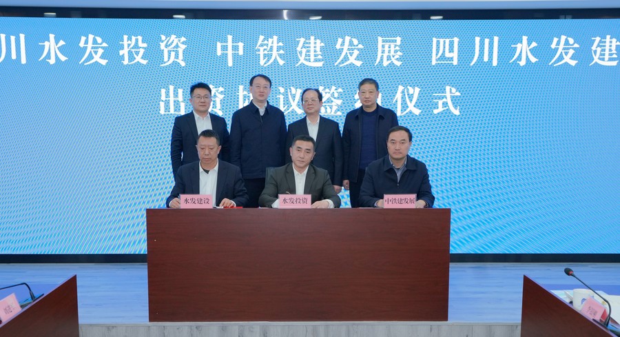 四川水發(fā)投資有限公司黨委副書記、總經(jīng)理郎波,四川水發(fā)建設(shè)有限公司副總經(jīng)理李銀剛,中鐵建發(fā)展集團公司副總經(jīng)理劉小剛共同簽署出資協(xié)議。