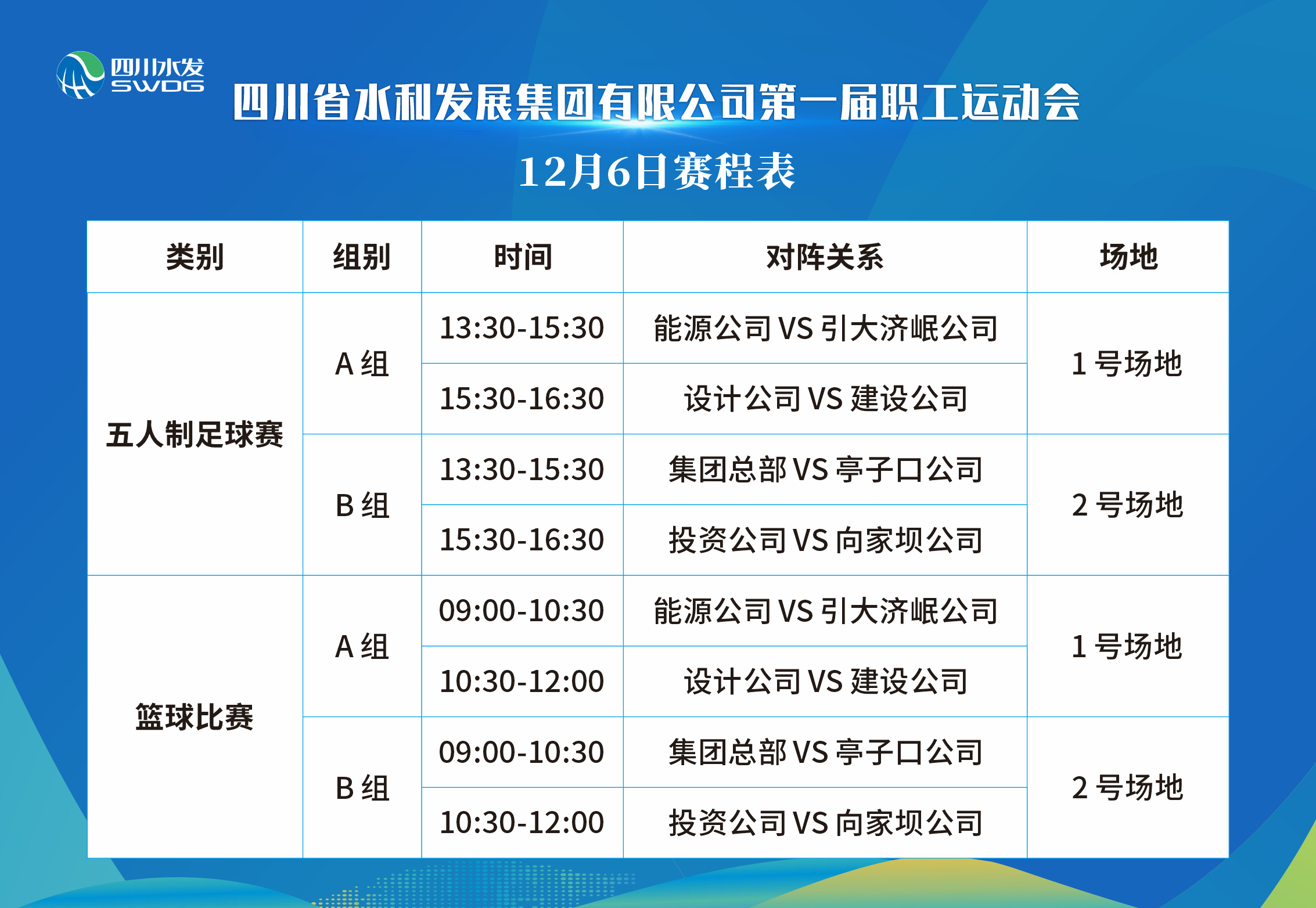 此次運(yùn)動(dòng)會(huì)分為2個(gè)階段。12月5日-12月8日為預(yù)賽階段,比賽項(xiàng)目包括:五人制足球賽、籃球賽、羽毛球混合團(tuán)體賽、乒乓球混合團(tuán)體賽,來自集團(tuán)總部及7個(gè)下屬公司共220余名運(yùn)動(dòng)員以循環(huán)賽和排位賽的方式角逐4個(gè)類別,8個(gè)決賽名額。12月9日,將舉行此次運(yùn)動(dòng)會(huì)開閉幕式,球類比賽決賽以及趣味運(yùn)動(dòng)會(huì)。