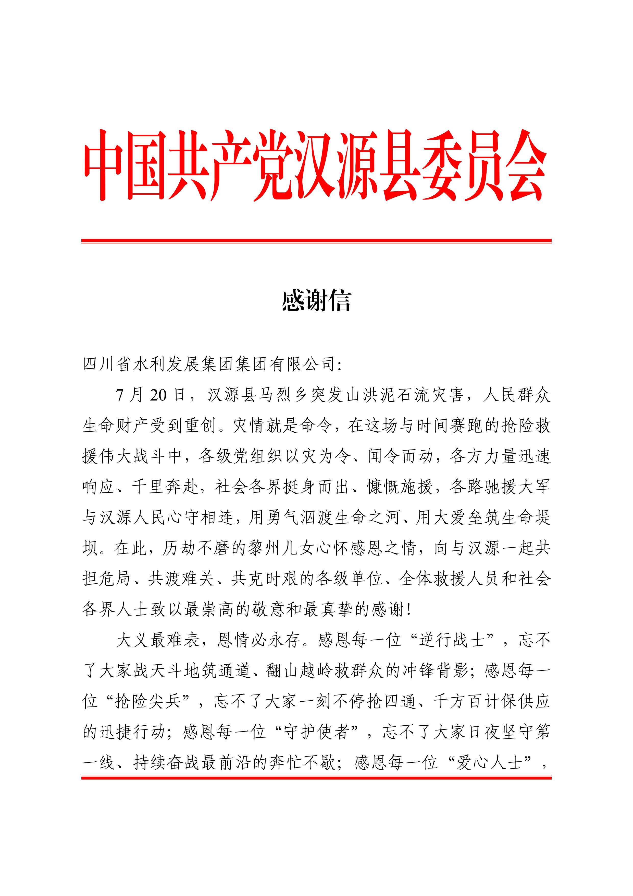 日前,集團(tuán)收到來(lái)自中共漢源縣委、漢源縣人民政府的感謝信,信中對(duì)集團(tuán)在“7?20”漢源縣馬烈鄉(xiāng)突發(fā)山洪泥石流災(zāi)害應(yīng)急搶險(xiǎn)救災(zāi)中迅速響應(yīng)、行動(dòng)有力表示了衷心的感謝,對(duì)搶險(xiǎn)人員的日夜堅(jiān)守和全力以赴表達(dá)了崇高的敬意。